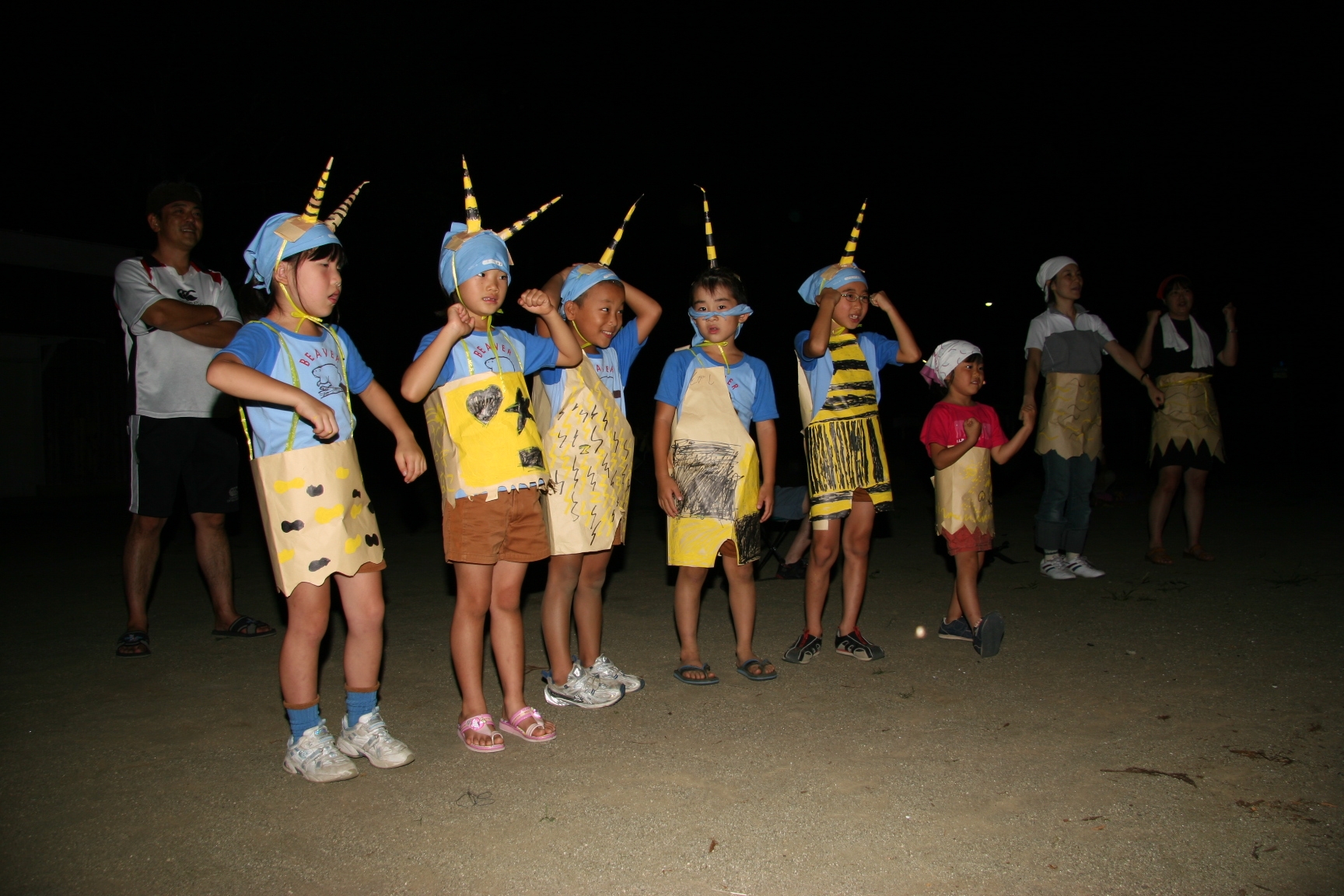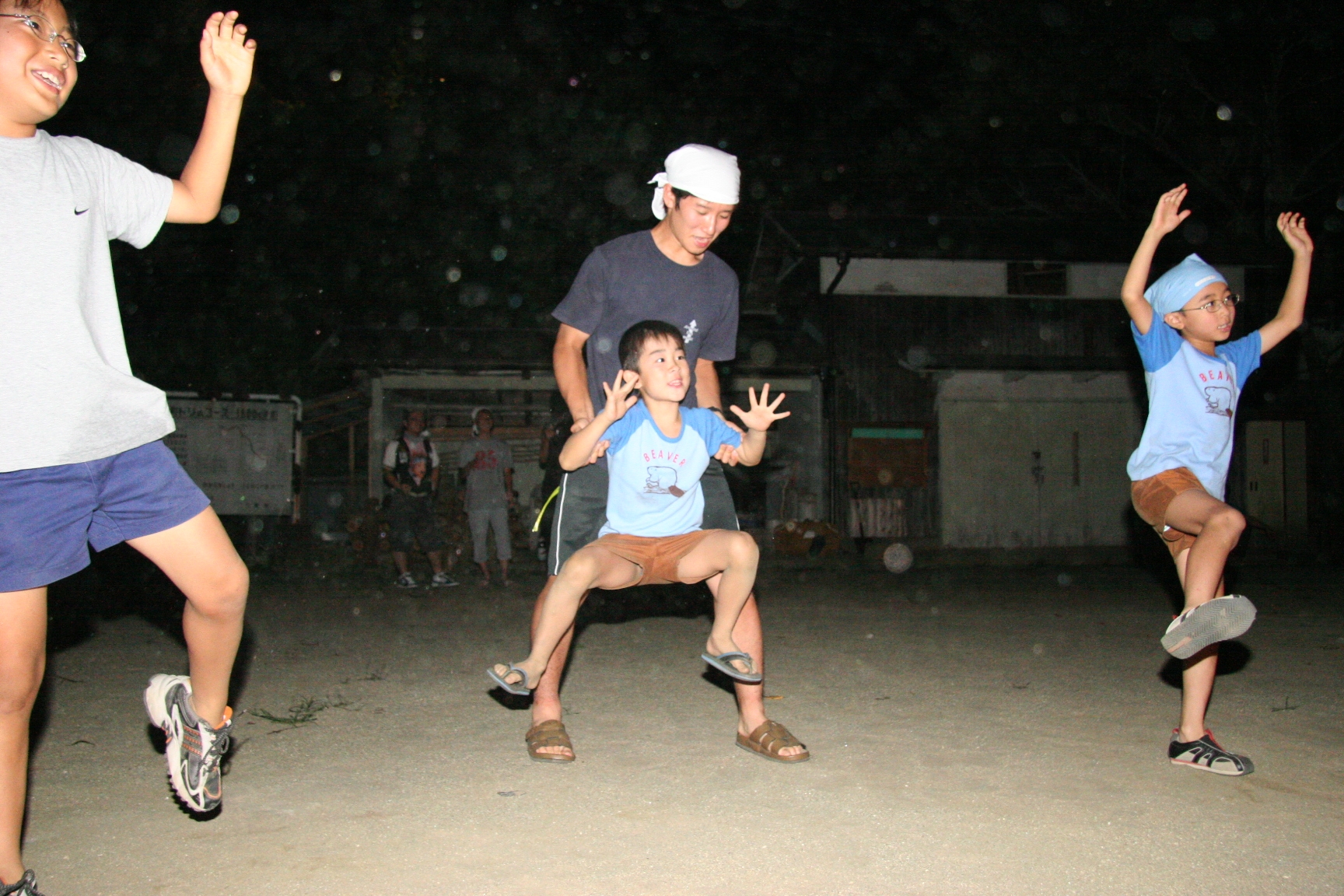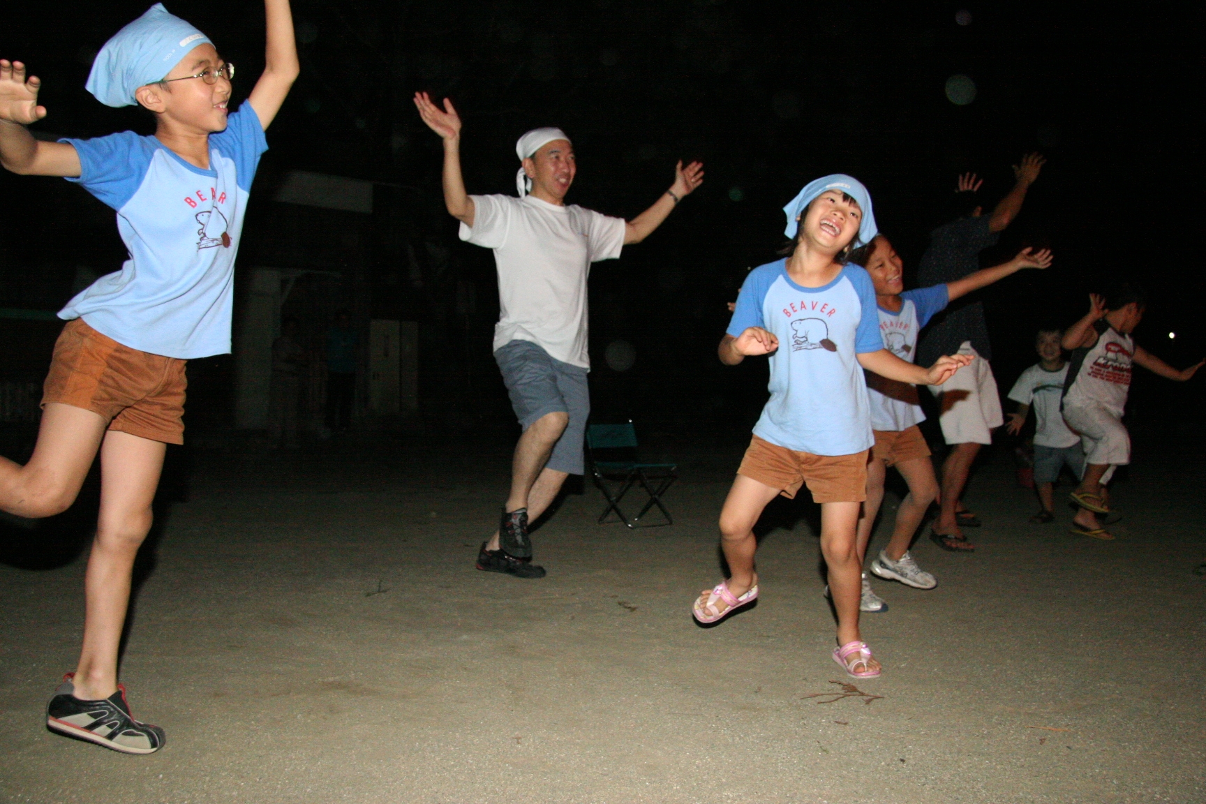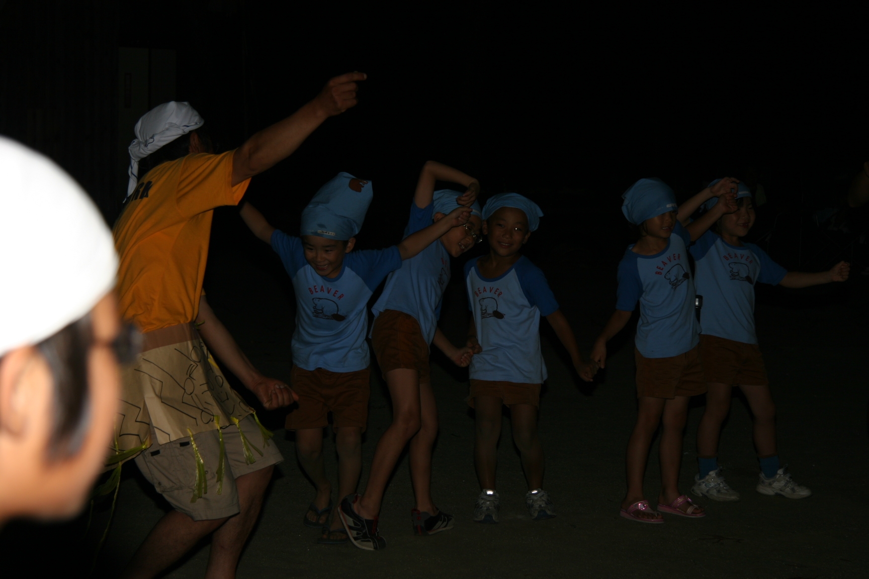 一日目は気温も高く蒸し暑い日でしたが、みんなよく遊んで汗びっしょりでした。鬼のパンツの振り付けは最初は恥ずかしがっている子もいましたが、最後はみんなできめてくれてよかったです。キャンプが初めての人もいましたが、普段と異なる環境でみんな楽しんでいるようでした。(土山ビーバー隊長)