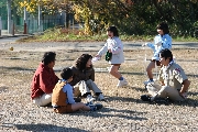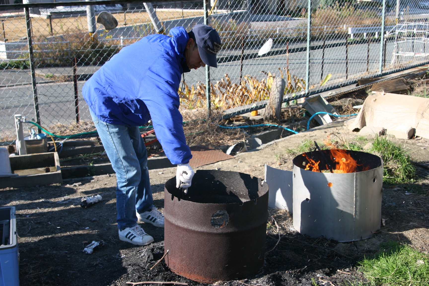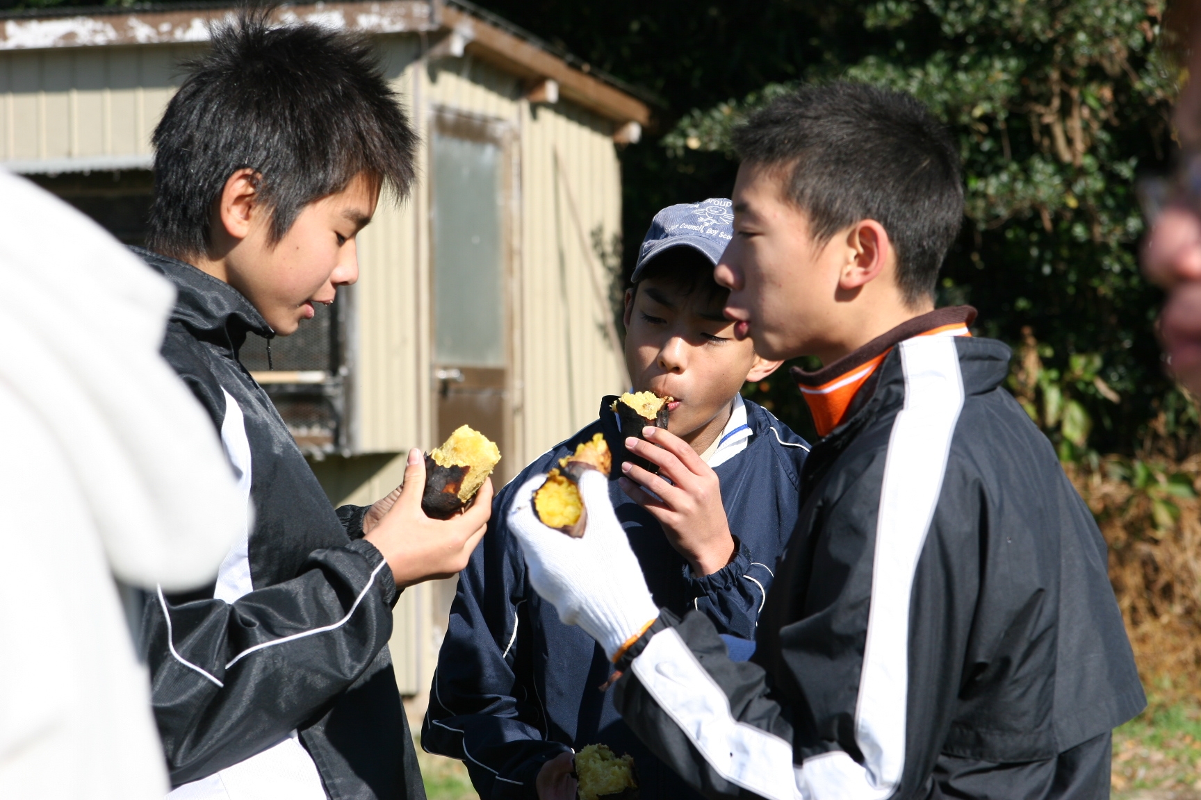 やきいもが焼けるまでの時間にみんなで竹ぽっくりをして遊びました。竹ぽっくりが初めての人もいて、最初は夢中になっていました。やきいもはみんな大好きで、おいしそうに食べていました。
