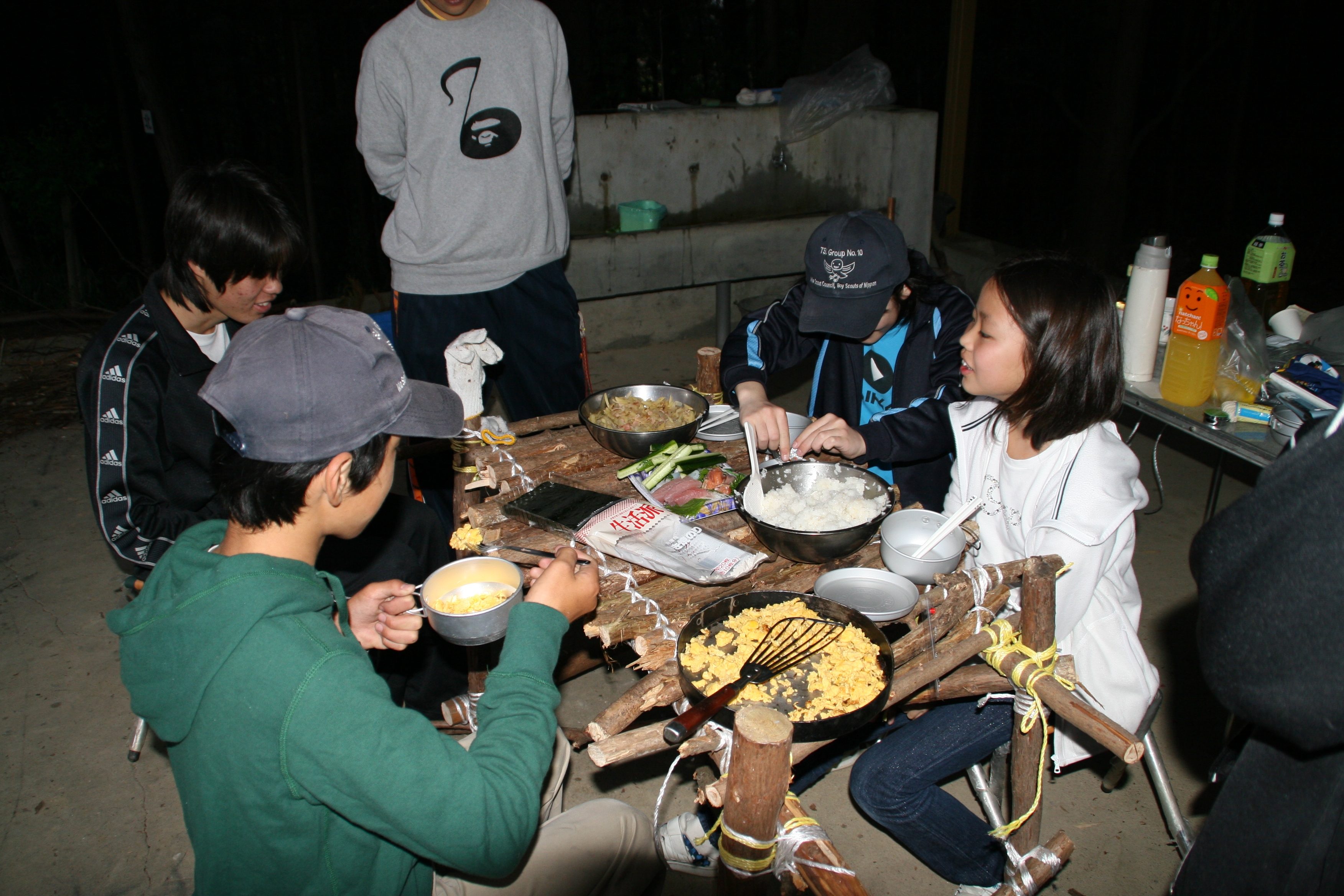 今回は、スカウト自身でキャンプにおける個人と全体目標を立て、行程計画をし実施したところ、初めての工作物であるテーブル作り、初めての手巻き寿司作りに挑み両方とも上手にできることが出来ました。