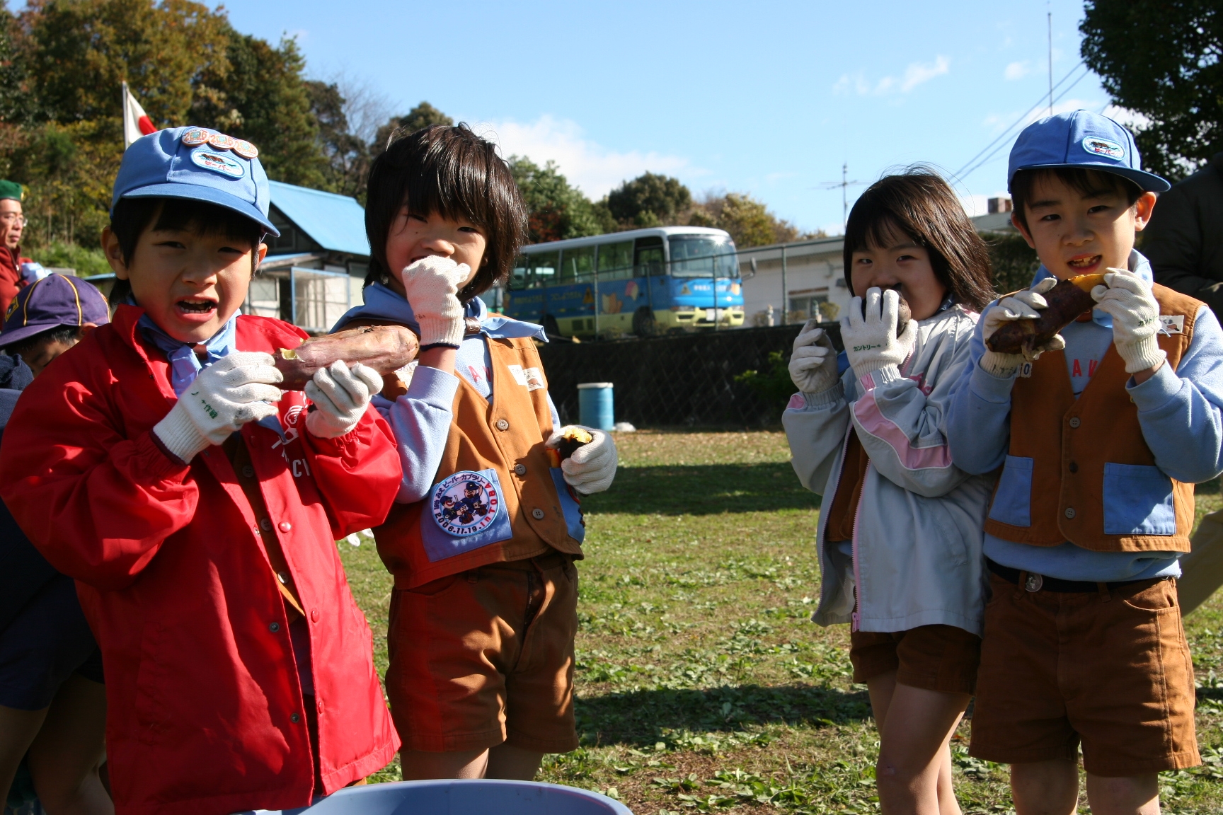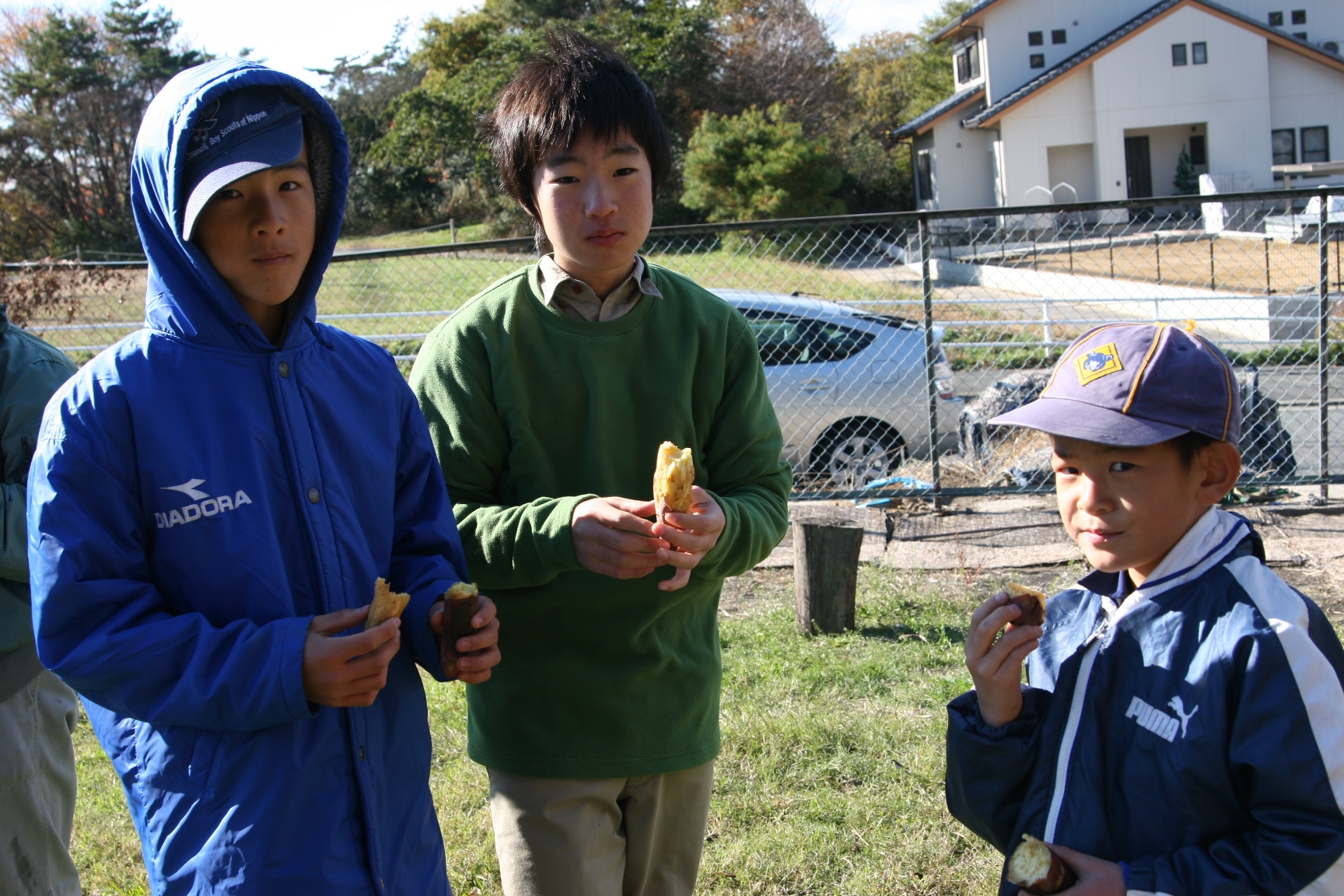 やきいもが焼けるまでの時間にみんなで竹ぽっくりをして遊びました。竹ぽっくりが初めての人もいて、最初は夢中になっていました。やきいもはみんな大好きで、おいしそうに食べていました。