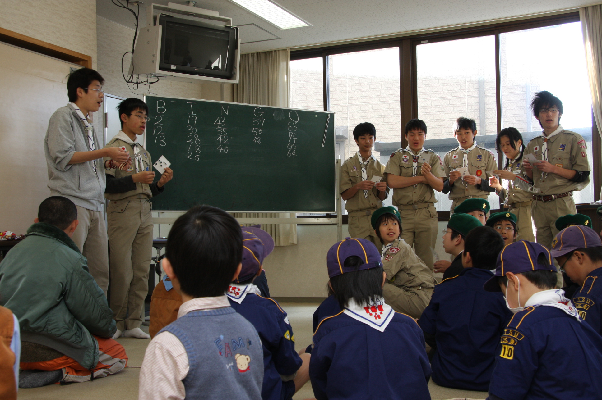 セレモニーでちかいとおきてを実唱し、その後のベンチャー隊主催のレクでBPクイズ、ビンゴゲーム、そしてじゃんけん列車ゲームを通してしてビーバー、カブのみんなと楽しく交流できました。(小瀬古団委員)